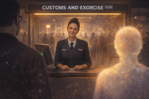 You’ll find her behind Customs and Exorcise Booth 12,182, an island of calm in the middle of the Infinitium’s endless administrative tide. She has one of those open, friendly faces that makes you feel instantly seen and inexplicably guilty, like a primary-school teacher who already knows you were the one who drew something inappropriate in the margin and is choosing kindness purely for sport.