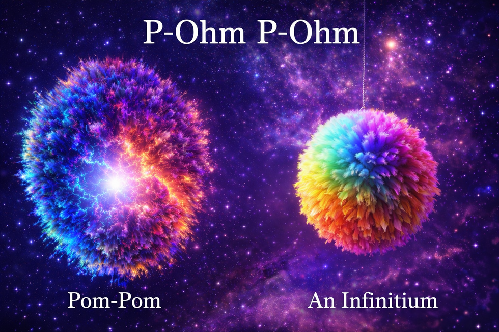 "If you’d like to understand what your whole 5D Infinitium looks like in simplistic 3D, well then, that’s easy, and absurdly, ridiculously, almost insultingly so. So, let’s not overthink it. I’ll make it simple. Manageable. Something your poor 3D+T brain can wrap itself around without melting through the floor. Forget the spirals. Forget the fractals. Forget the endless loops of cosmic jazz. Imagine instead… A pom-pom! Yes, you heard me. A pom-pom. Those cheerful little fluff-balls hang from winter hats. They bounce on scarves. Sometimes, they're enthusiastically assaulted by cats for looking at them the wrong way. The universe, distilled into something you could hang off any winter-related clothing. A soft, fluffy explosion of yarn, the pom-pom is a sphere about the size of your fist. Its individual strands, red, blue, gold, and white, loop and curl back into themselves, each thread catching the light as it moves, pretending to be harmless. Each fibre representing a single strand of life. It’s absurd, I know; but so is existence, and that’s half the fun of it. It even sounds spiritual when you say it out loud… P-ohm-p-ohm… Look, here, I’ve got one. You should never underestimate a man who travels through metaphysics with craft supplies."